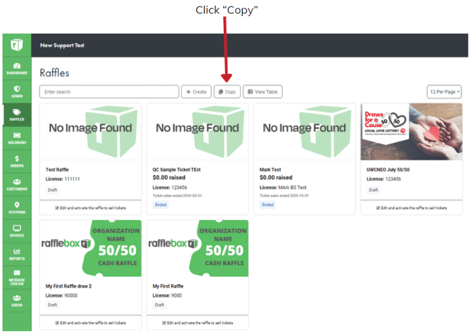 For more info on this process, Click here for a full guide. - The next step will be to copy your previous raffle. To start this, click the "Copy" button under the Raffle tab.